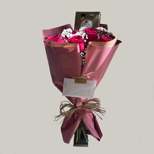 Além disso, o buquê acompanha uma caixa de bombons Ferrero Rocher T4, reconhecida mundialmente pelo seu sabor sofisticado. Dessa forma, o presente se torna ainda mais completo, combinando a delicadeza das flores com a indulgência do chocolate premium.