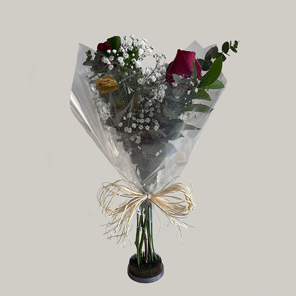 Buquê delicado com 2 rosas vermelhas intensas, simbolizando carinho e paixão. Embalagem elegante que pode variar conforme disponibilidade.